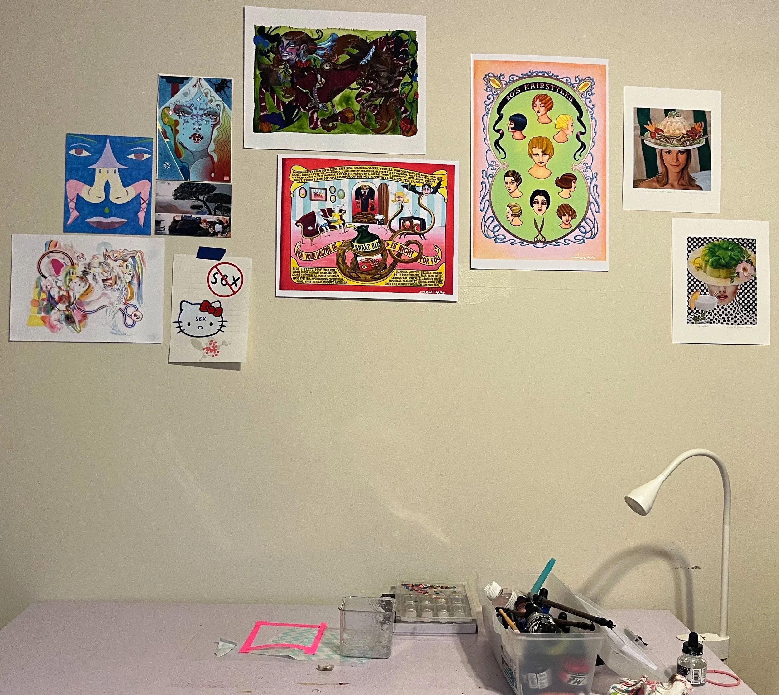 Izzy Thomas mainly works at the drawing table in her room, and finds that sterile looking environments is where she can feel most productive and creative. Her space is decorated in a calculated manner, where there is designated space for chaos. She decorates with single pieces from collectables; a collection of collectables, and prints from artists she admires like Juliana Horner, Ines Longevial, Anna Degnbol, and Laura Callaghan. Thomas takes photos of limited edition and ornate food items, over the top fashion items, micro celebrities, product packaging, and weird alien-like plants. Cities are where she can find most of her inspiration, as this is where one can witness a microcosm of a certain place's culture, this is visually a big inspiration for Thomas. When she is not making art, Thomas can be found spending time with her friends. Most of Thomas' friends are not in the arts, as she feels that being an artist has made her overly preoccupied with her preferred taste and aesthetic, and she enjoys a variety of perspectives that are not visually motivated.